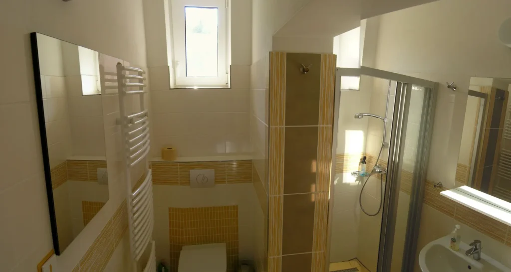 V koupelně se nachází sprchový kout, dvě umyvadla, WC a bidet. Druhé samostatné WC s umývátkem zvyšuje komfort při pobytu více osob. Obývací část disponuje velkou rohovou sedačkou, dětským koutkem a TV. Z obytné místnosti je vstup na venkovní terasu s posezením, která vede přímo do zahrady, což vytváří ideální prostředí pro relaxaci.