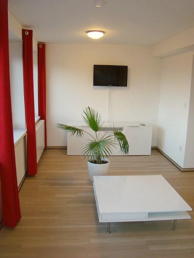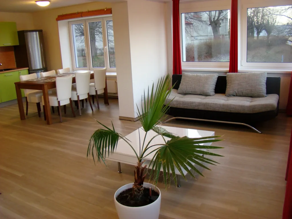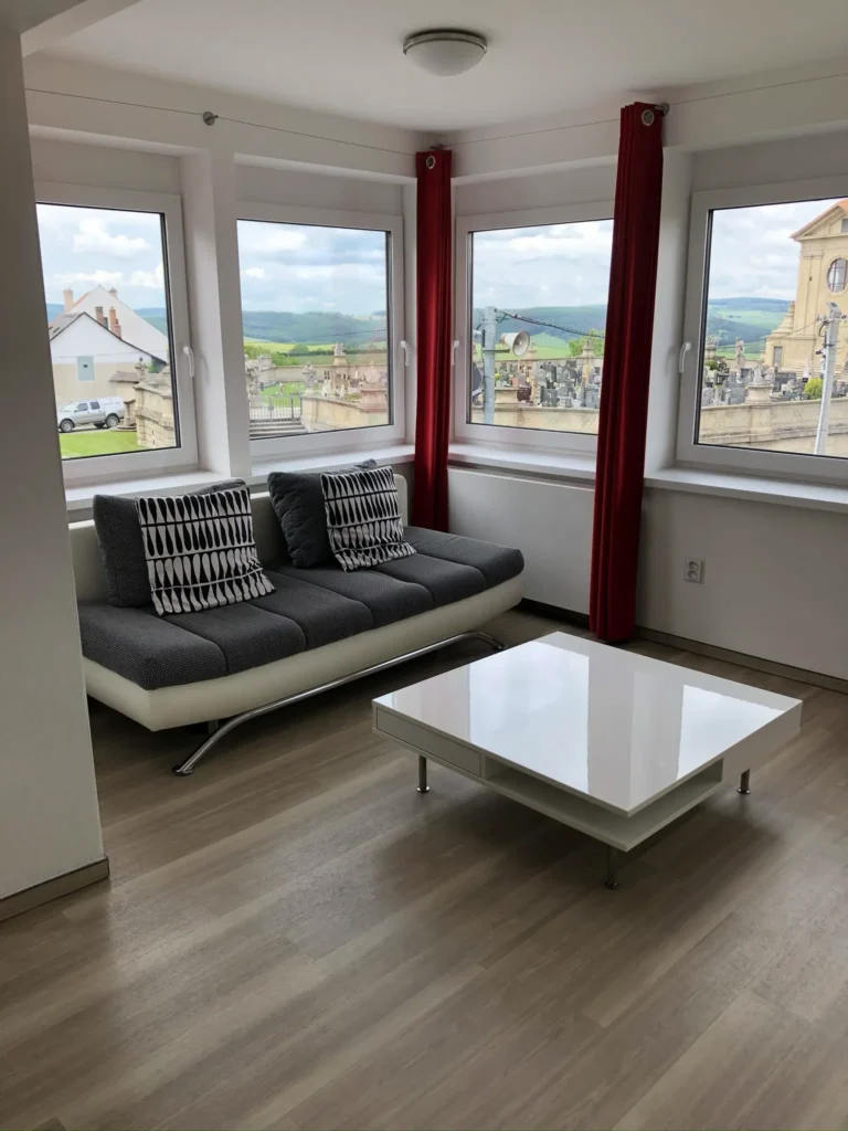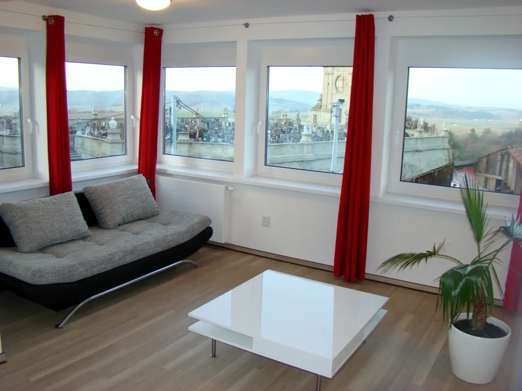 Apartmán Panorama o rozloze 78 m² je ideální pro páry i menší rodiny, které ocení krásný výhled a moderní pohodlí. Dominantou apartmánu je prosklená veranda s panoramatickým výhledem do okolní krajiny, kde se nachází pohovka, stolek a TV.