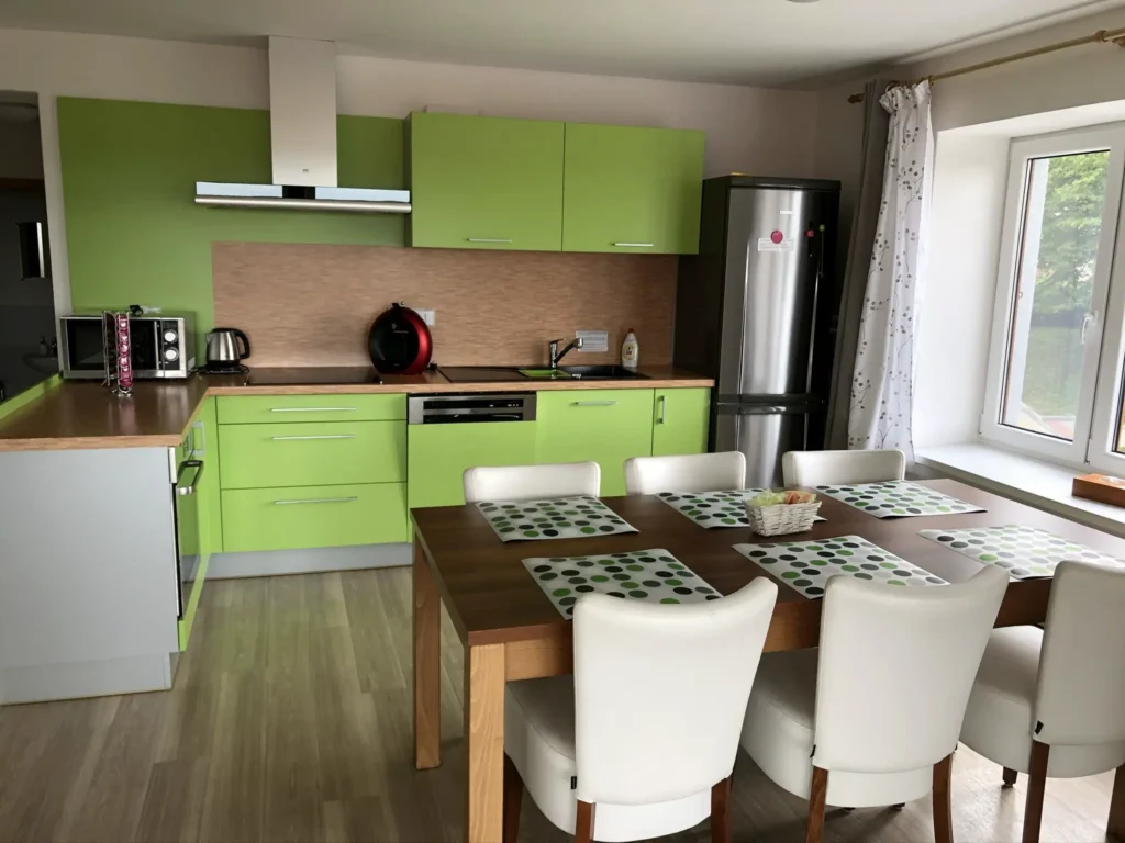 Obývací část propojená s kuchyní nabízí plně vybavenou kuchyňskou linku včetně myčky, lednice s mrazákem, indukční varné desky, trouby, mikrovlnky a kávovaru. Jídelní kout je ideálním místem pro společné stolování. Díky modernímu designu a unikátní atmosféře poskytuje tento apartmán jedinečný zážitek z pobytu.