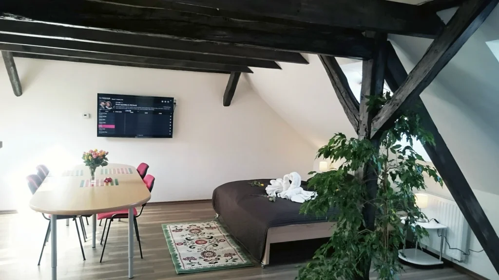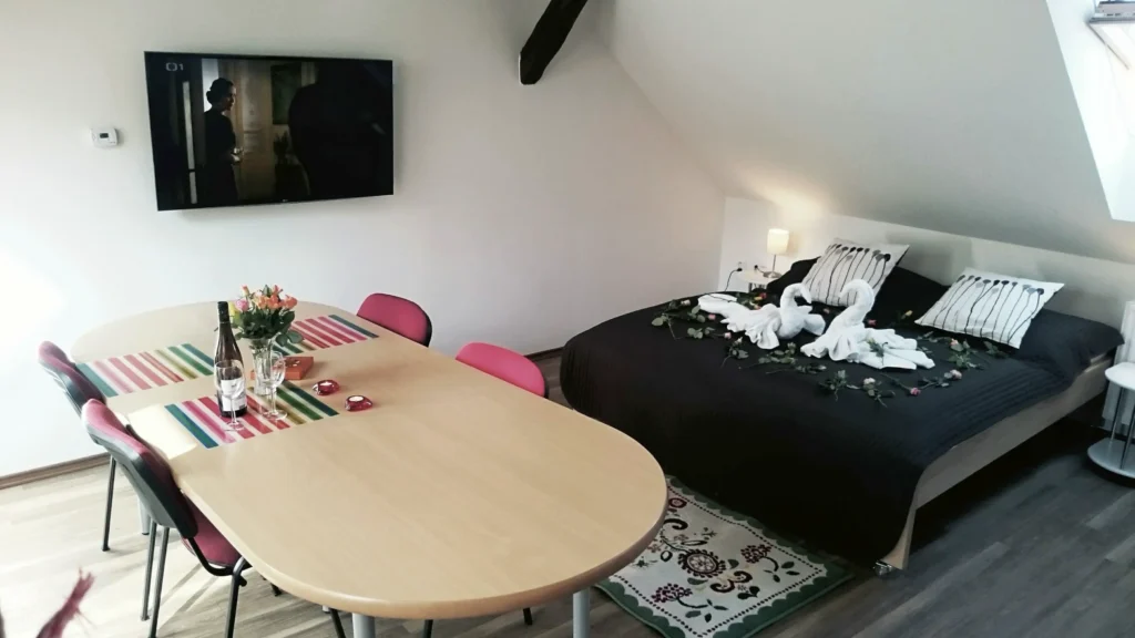 Apartmán sestává ze dvou místností – praktické předsíně pro uložení zavazadel a prostorné obytné části. Ta je vybavena manželskou postelí, stolem a pohodlným posezením. Součástí je plně vybavená kuchyňská linka s varnou deskou, kávovarem, mikrovlnnou troubou a varnou konvicí. Moderní vybavení zahrnuje Smart TV (50″), klimatizaci a rychlou Wi-Fi.